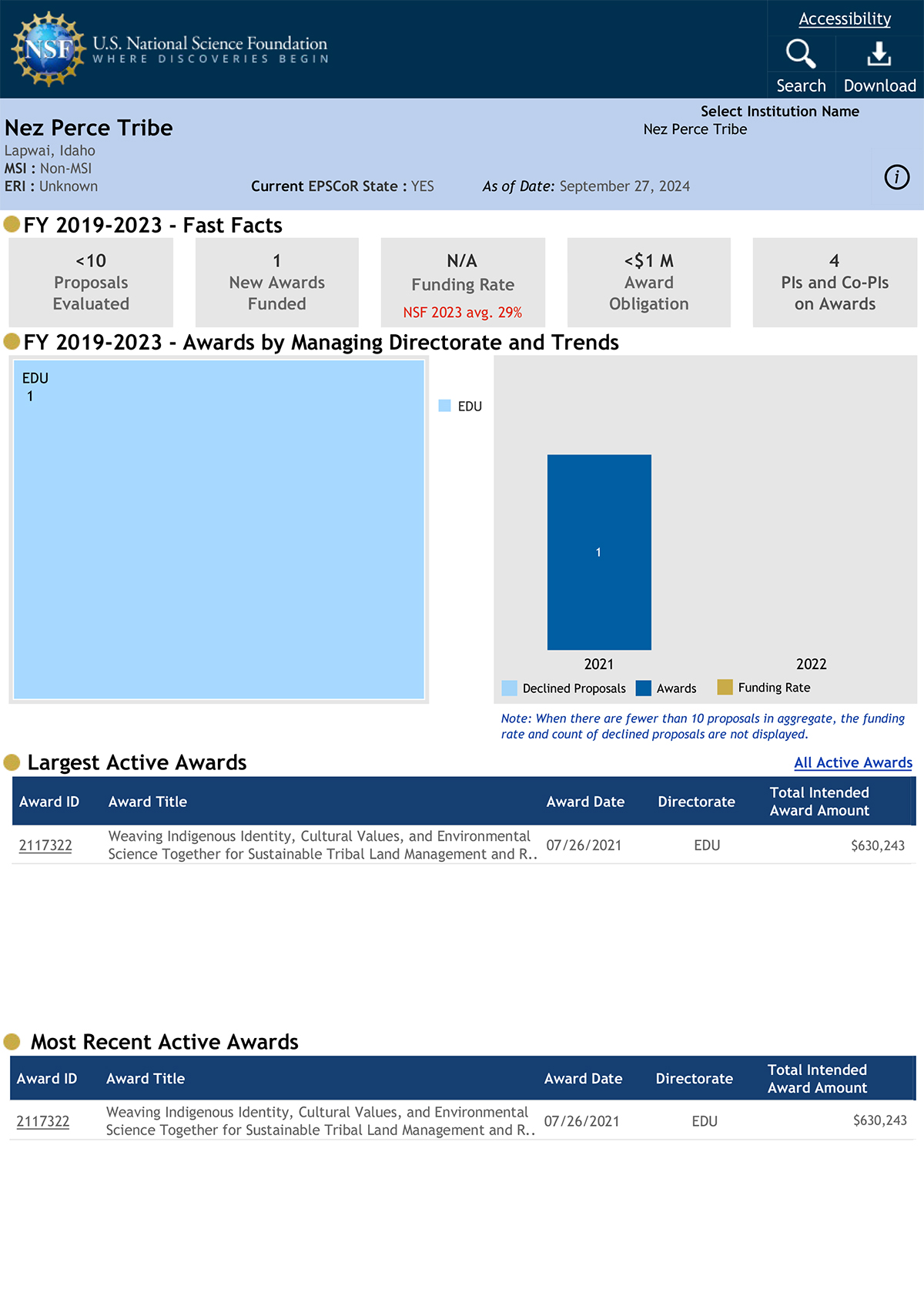 NSF by the numbers provides statistical and funding information for awards, NSF-funded institutions, funding rate, proposals evaluated, and obligations by fiscal year.